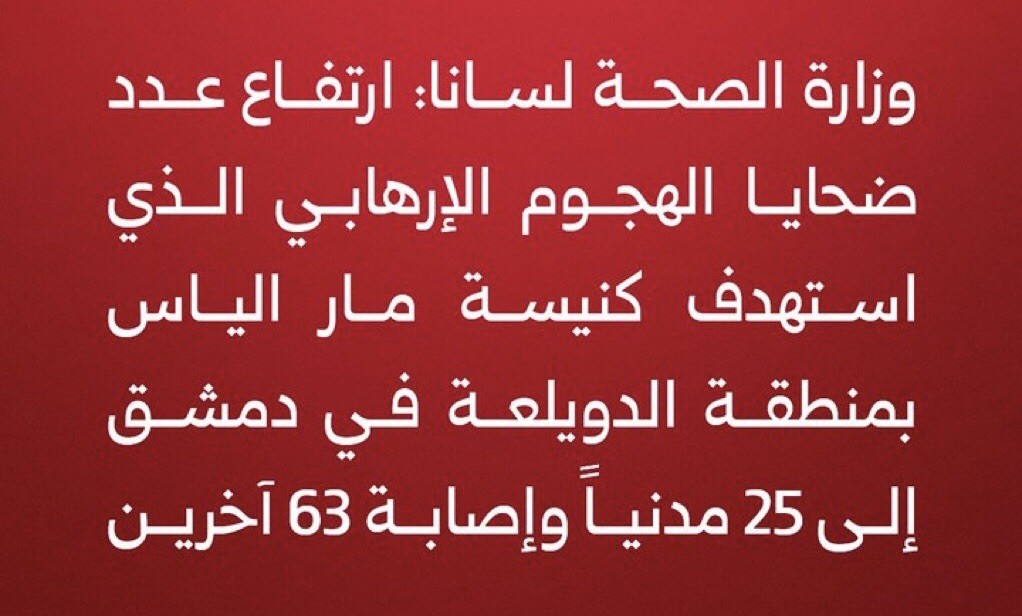 من جهة أخرى، قالت وزارة الصحة السورية أن حصيلة التفجير الذي استهدف كنيسة مار إلياس، ارتفعت إلى 25 قتيلا و63 مصابا .
