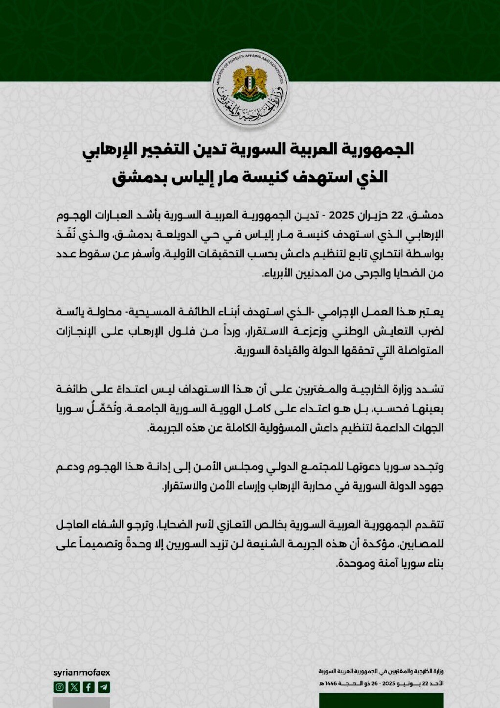 أفاد المتحدث باسم وزارة الداخلية السورية نور الدين البابا في مؤتمر صحفي، مساء الأحد، بأن التقييمات الأولية تشير إلى أن هجوم كنيسة مار إلياس في دمشق نفذه تنظيم “داعش” الإرهابي.