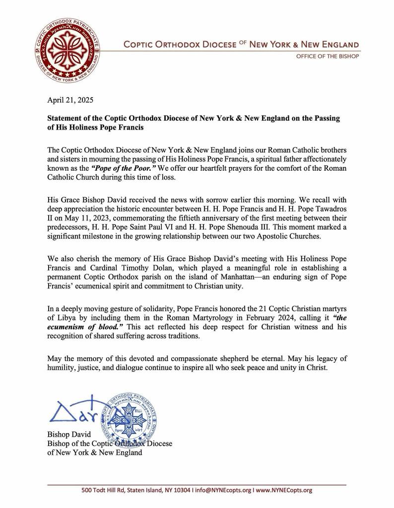 أصدرت إيبارشية نيويورك ونيو إنجلاند بالولايات المتحدة الأمريكية برعاية نيافة الحبر الجليل الأنبا ديفيد أسقف الإيبارشية بياناً ناعية فيه قداسة البابا فرنسيس بابا الفاتيكان ، وجاء نص البيان كما يلي :