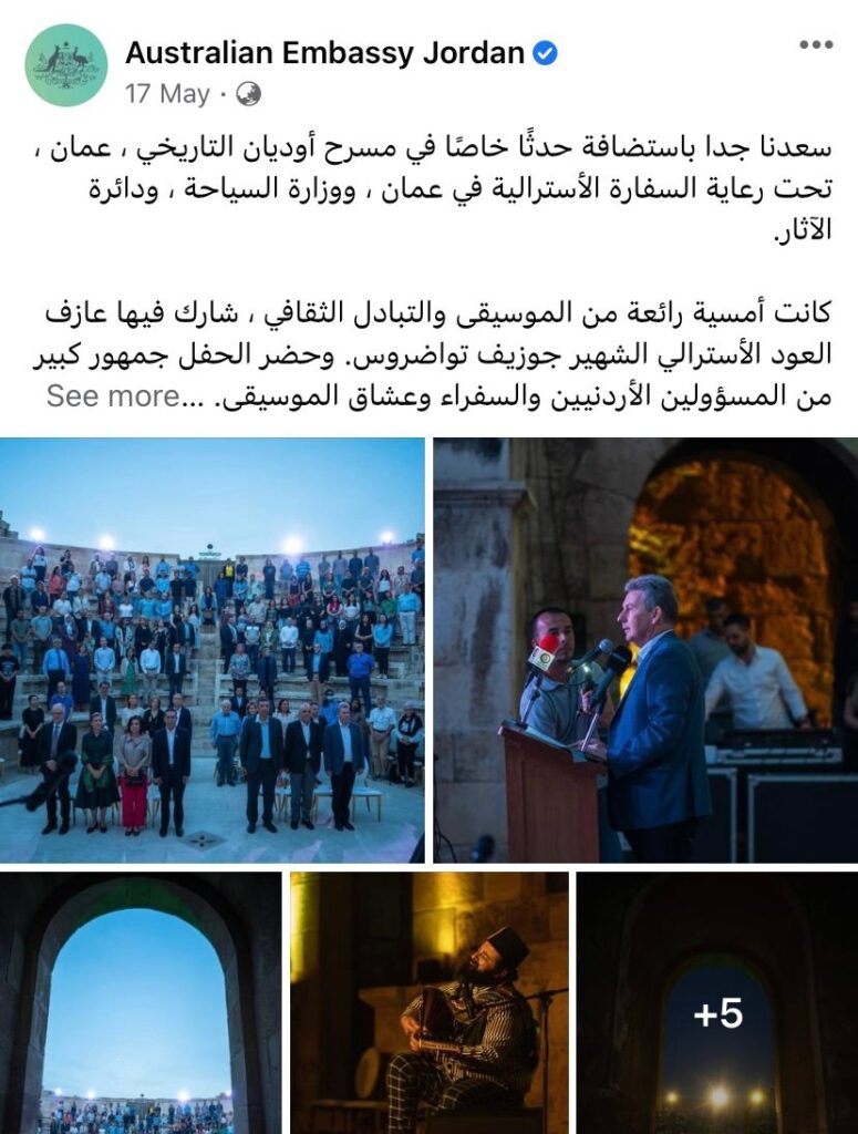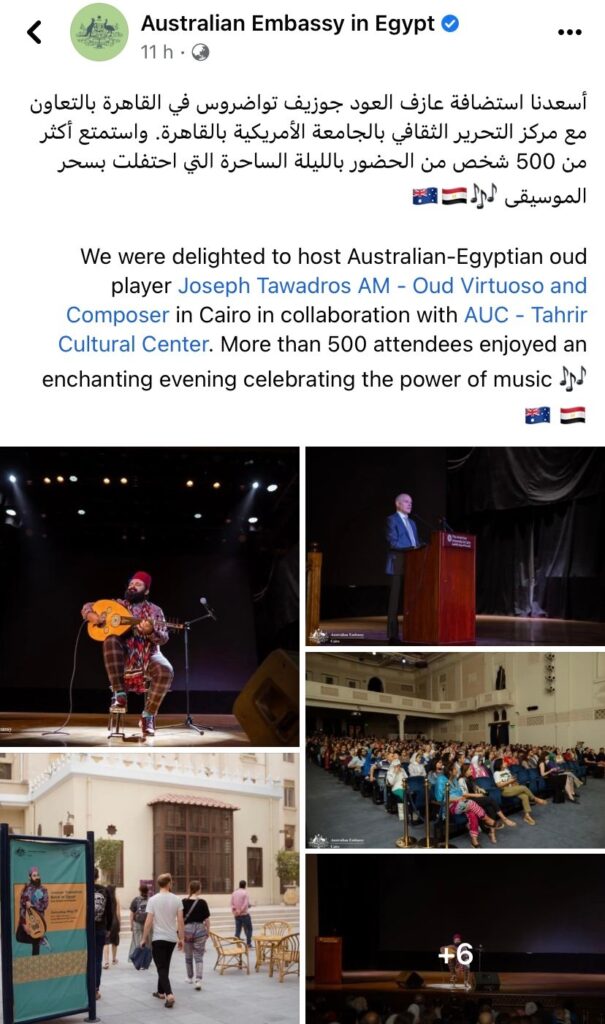 ناشد الكاتب الصحفي اشرف حلمي المقيم بأستراليا ، الحكومة الأسترالية بقيادة السيد أنتوني البانيزى رئيس الوزراء الفيدرالي ، بتكريم الموسيقار الأسترالي جوزيف تواضروس فى العيد الوطني لأستراليا للعام القادم ٢٠٢٤ ، وذلك فى أعقاب نجاح الحفلات الموسيقية التي قام بها الفنان تواضروس خلال شهر مايو الجاري ، والتي استضافتها كل من السفارة الأسترالية بالأردن يوم الأحد الموافق ١٤ مايو الجارى ، بالتعاون مع منظمة اليونيسف لدعم الأطفال اللاجئين المقيمين بالأردن ، والسفارة الأسترالية بالقاهرة ، بالتعاون مع مركز التحرير الثقافي بالجامعة الأمريكية بالقاهرة أول أمس السبت الموافق ٢٧ مايو .