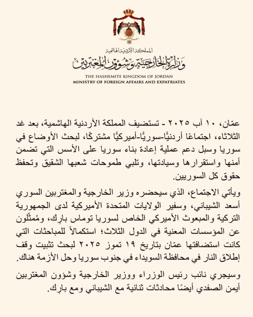 ويأتي الاجتماع، الذي سيحضره وزير الخارجية والمغتربين السوري أسعد الشيباني، وسفير الولايات المتحدة الأميركية لدى الجمهورية التركية والمبعوث الأميركي الخاص لسوريا توماس بارِك، ومُمثّلون عن المؤسسات المعنية في الدول الثلاث؛ استكمالاً للمباحثات التي كانت استضافتها عمّان بتاريخ 19 يوليو تموز 2025 لبحث تثبيت وقف إطلاق النار في محافظة السويداء في جنوب سوريا وحل الأزمة هناك.