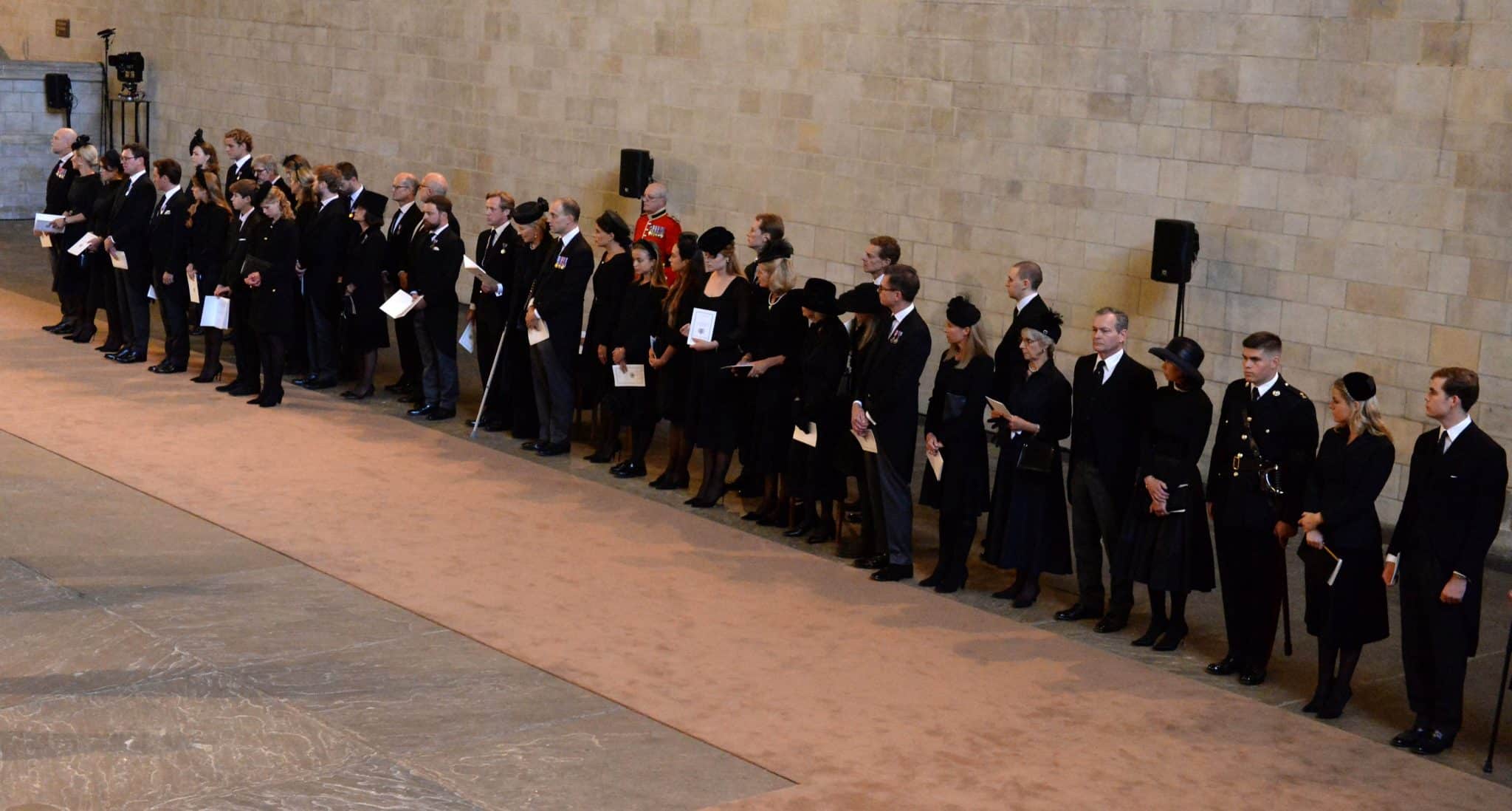 وعندما وصل الموكب لقاعة وستمنستر، وهو مبنى من العصور الوسطى يعود تاريخه إلى عام 1097 وأقدم جزء من مبنى البرلمان، حمل جنود من فرقة المشاة النعش إلى الداخل ووضعوه على منصة محاطة بالشموع.