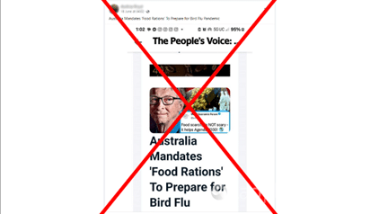 AAP FACTCHECK – حكومة أستراليا تسن قوانين ترشيد غذائي تحضيرًا لجائحة إنفلونزا الطيور، وفقًا لمقالة منتشرة على وسائل التواصل الاجتماعي.