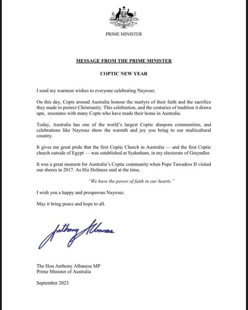 بعث السيد أنتوني البانيزي رئيس الوزراء الأسترالي صباح اليوم الثلاثاء الموافق ١٢ سبتمبر ، رسالة تهنئة للجالية القبطية الأسترالية بمناسبة عيد رأس السنة القبطية ، و قال السيد البانيزى في رسالته أبعث بأحر التمنيات لكل من يحتفل بعيد النيروز في هذا اليوم الذى يكرم فيه الأقباط بجميع أنحاء أستراليا شهداء عقيدتهم والتضحيات التي قدموها لحماية إيمانهم المسيحي ، هذا الاحتفال نتج عنه عادات وتقاليد يمارسها العديد من الأقباط الذين اتخذوا من أستراليا موطنًا لهم.