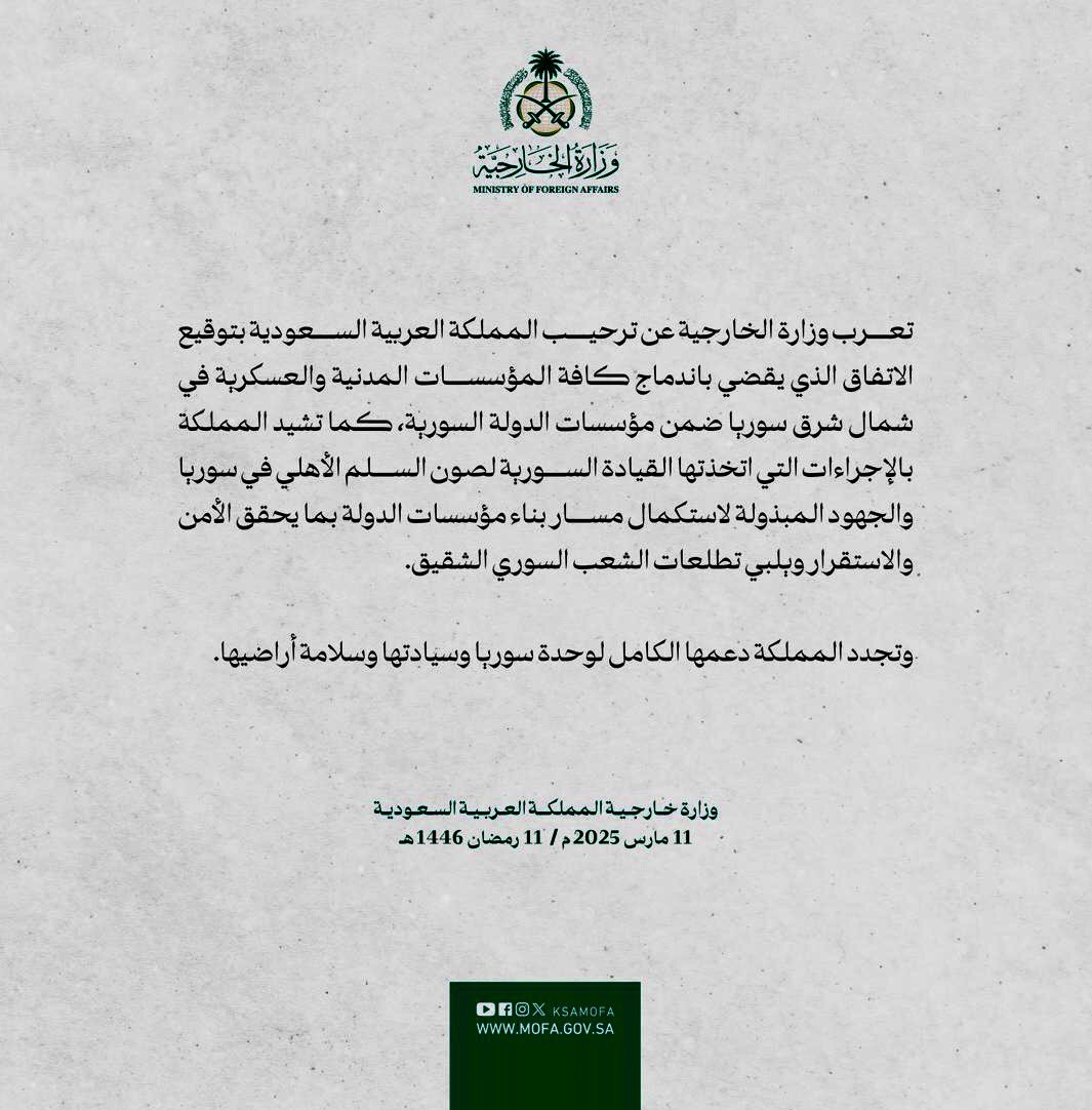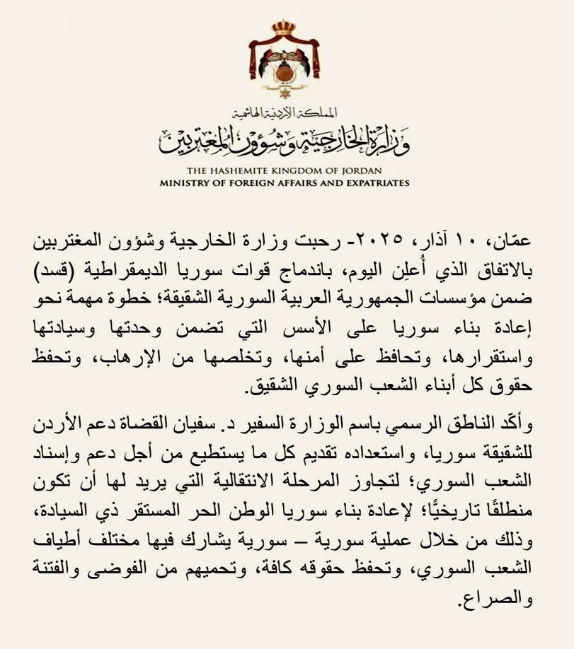 وأضاف البيان الذي وزعته ” قسد” أنه “في لحظة مفصلية من تاريخ سوريا، وبروح المسؤولية الوطنية، تم التوقيع على اتفاق بين القائد العام لقوات سوريا الديمقراطية، مظلوم عبدي، والرئيس أحمد الشرع، ليكون خطوة أساسية نحو بناء سوريا جديدة، دولة ديمقراطية تعددية تحترم حقوق جميع مكوناتها، وتستند إلى دستور يعبر عن إرادة السوريين والسوريات، ويؤسس لجمهورية حديثة تتناسب مع تطلعات الشعب السوري وتضحياته”.