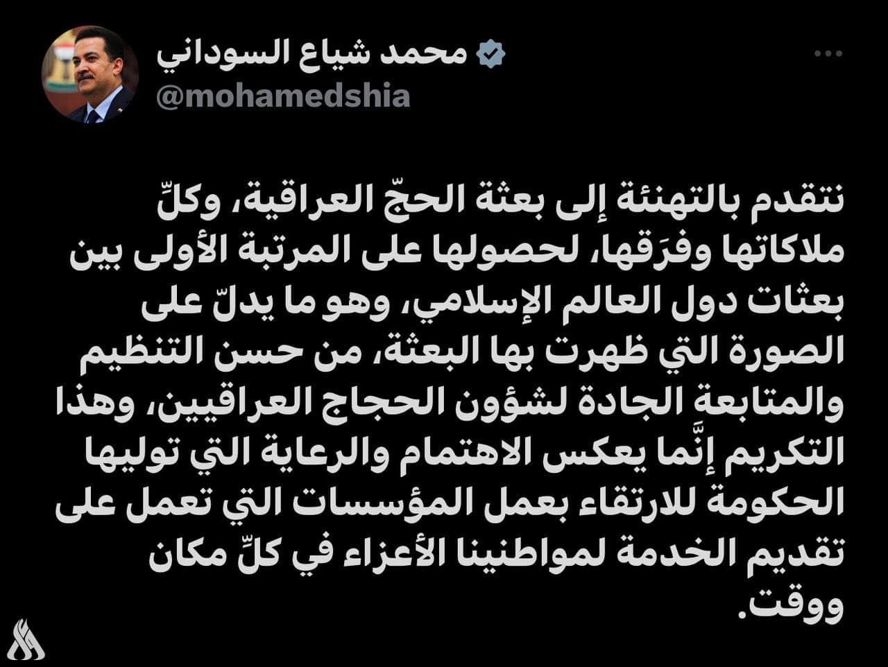 رئيس الوزراء العراقي يهنئ بعثة الحجّ لحصولها على المرتبة الأولى بين بعثات دول العالم