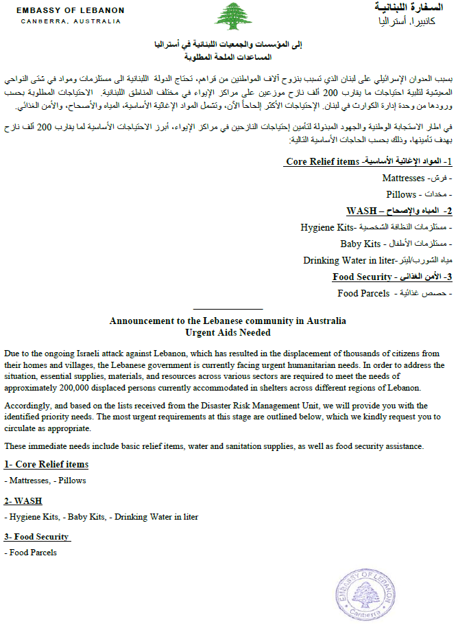 Lebanese Embassy in Canberra Calls for Urgent Community Support Following Crisis in Lebanon Read More »