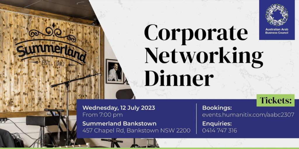 Indulge your senses and broaden your professional horizons at the Australian Arab Business Council’s iconic corporate networking dinner at a Summerland Lebanese restaurant renowned for its exceptional and traditional banquets.