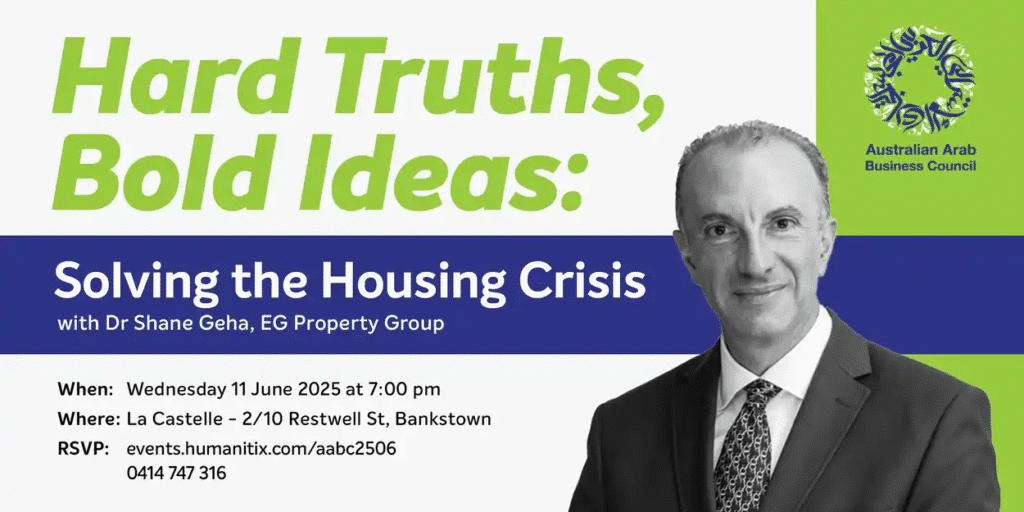 The Australian Arab Business Council invites you to hear from Australia’s foremost rezoning expert, Dr Shane Geha, as he explores the hard truths behind our housing gridlock—and the bold ideas that could transform it.