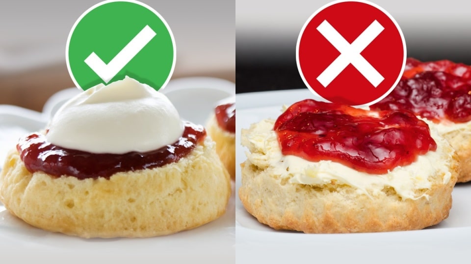 If the cream is hard and thick, she said, it should be spread first. But if the cream is whipped, it should go on top of the jam.