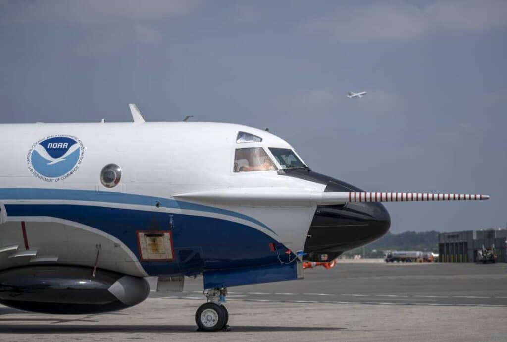 The National Oceanic and Atmospheric Administration’s Orion hurricane hunter aircraft sits on the tarmac at Ronald Reagan Washington National Airport in 2022. Data gathered by the aircraft helps federal scientists issue hurricane warnings to the public. Gemunu Amarasinghe/AP