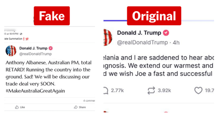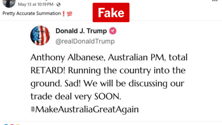 “Anthony Albanese, Australian PM, total RETARD! Running the country into the ground. Sad! We will be discussing our trade deal very SOON. #MakeAustraliaGreatAgain,” the purported post said. The post has tricked some Facebook users, with one commenting, “Pretty Accurate Summation”.