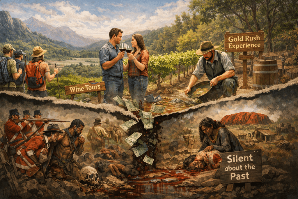 The reality is, tourism often ignores, obfuscates or manipulates the historical truth in favour of maintaining profit. Dark truths and ugly histories are quietly buried in the name of revitalising the economy or touting national prestige or some other generic cause that engenders some collective responsibility on society whilst ignoring the monied interests powering this industry. Every facet of tourism is geared towards making sure the visitor enjoys their time.