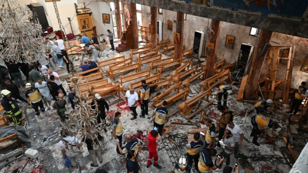 Witnesses and videos widely shared on social media showed shattered glass, bloodied floors, and overturned pews inside the church, with emergency lights flashing as rescue teams pulled out the dead and wounded.